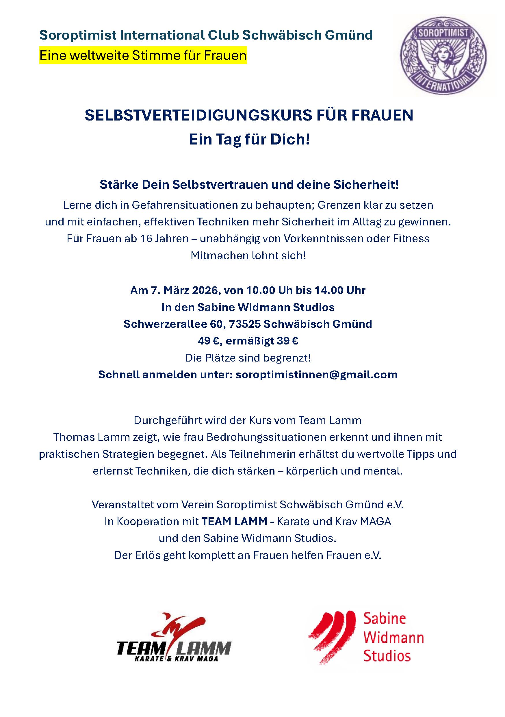 Am 7. März 2026 Selbstverteidigungskurs für Frauen „Ein Tag für Dich“ in Kooperation mit dem Team Lamm,
