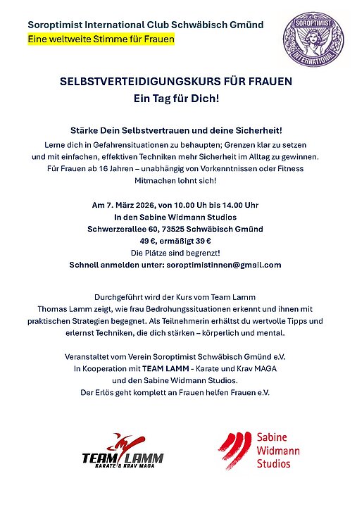 Am 7. März 2026 Selbstverteidigungskurs für Frauen „Ein Tag für Dich“ in Kooperation mit dem Team Lamm,